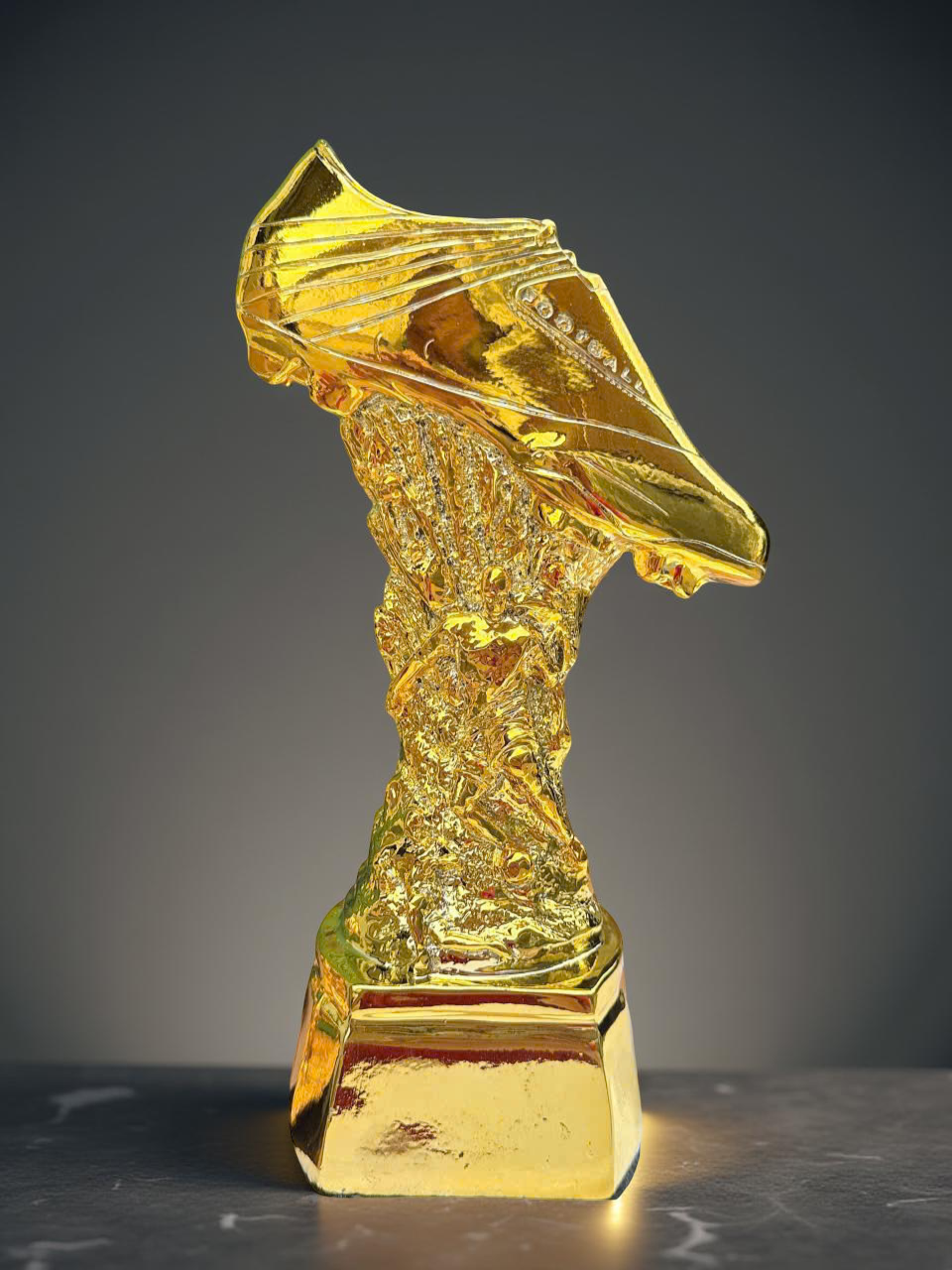 Được chế tác tỉ mỉ từ chất liệu nhựa cao cấp mạ vàng ánh kim hoặc hợp kim bền đẹp, cúp có hình chiếc giày bóng đá đặt trên đế cao vững chãi, thể hiện tinh thần kiêu hãnh và chiến thắng.